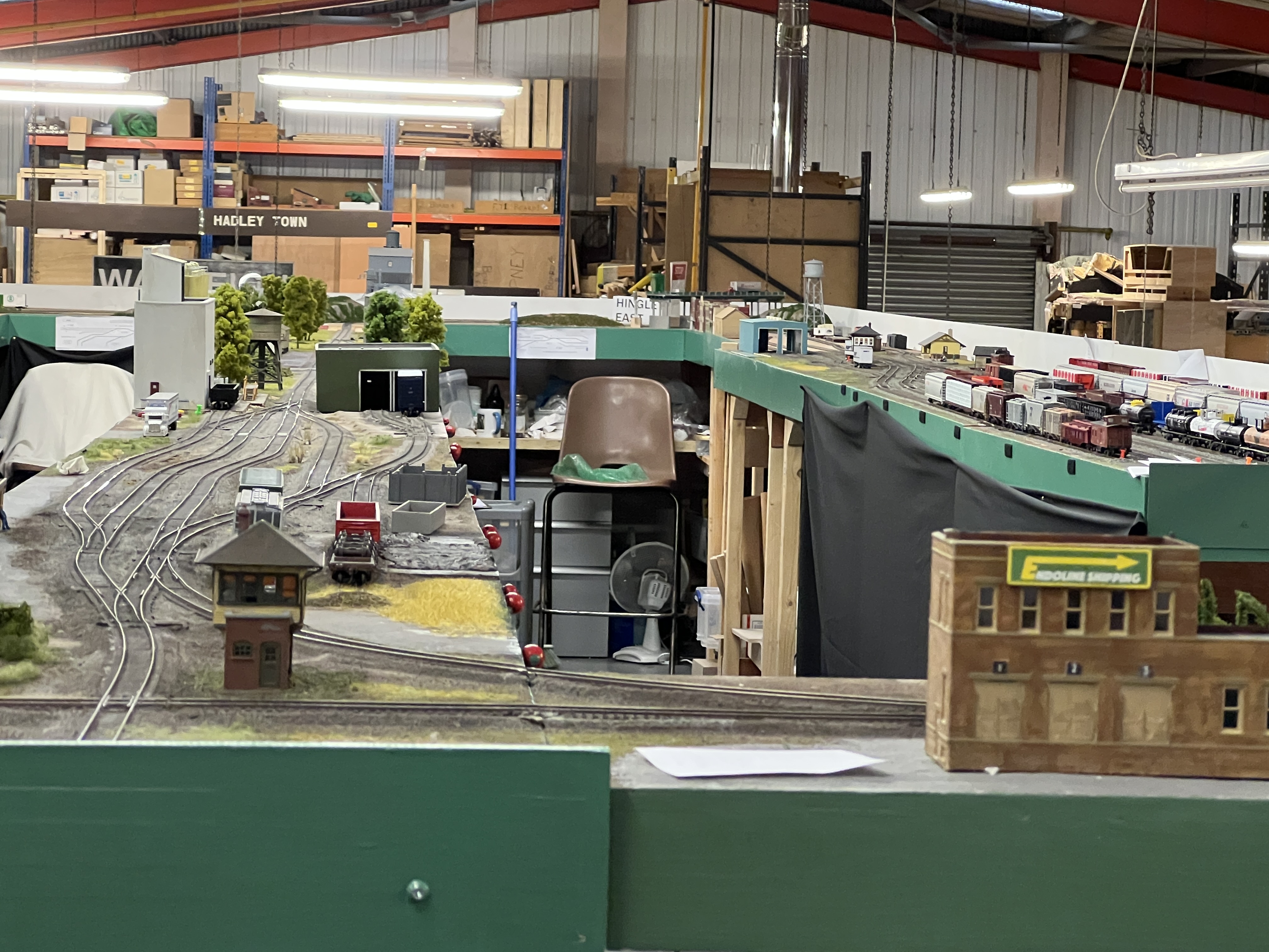 This layout has two levels, one for DCC and one for analogue. It is always up in the clubroom and provides a place for members to run their trains.